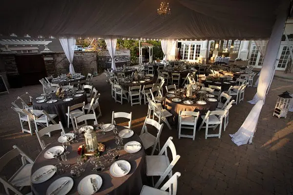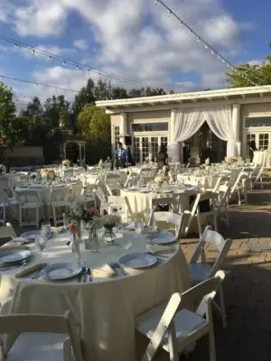Dove Canyon Courtyard allows you and your guests to enjoy the location for at least 5 hours of actual event time. We will also include (200) beautiful white folding chairs along with tables of varying sizes. And depending on weather, we have for your comfort and convenience either space heaters or gorgeous free-standing white sun umbrellas. During the months of November through April, our location has the added benefit of a large 50’x30′ white canopy lined with even more twinkle lights. At Dove Canyon Courtyard you have the freedom to bring in the caterer, florists, etc. of your choice, or we can help you select from our preferred vendor list. This enables you to control not only the style of your event but your budget as well.