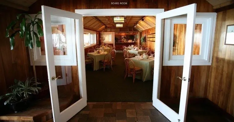Duke’s offers two primary private rooms for weddings and special events, each with its own personality. The larger oceanfront room is built directly over the water, with two sides of glass and doors that open onto a private balcony where guests can slip out to watch the sunset or listen to the surf. This space can accommodate a seated reception with a dance floor or a more casual, reception-style layout with passed hors d’oeuvres and food stations. A second, more intimate boardroom-style space is ideal for smaller weddings, rehearsal dinners, and private dining, while still keeping the focus on the ocean right outside the windows.